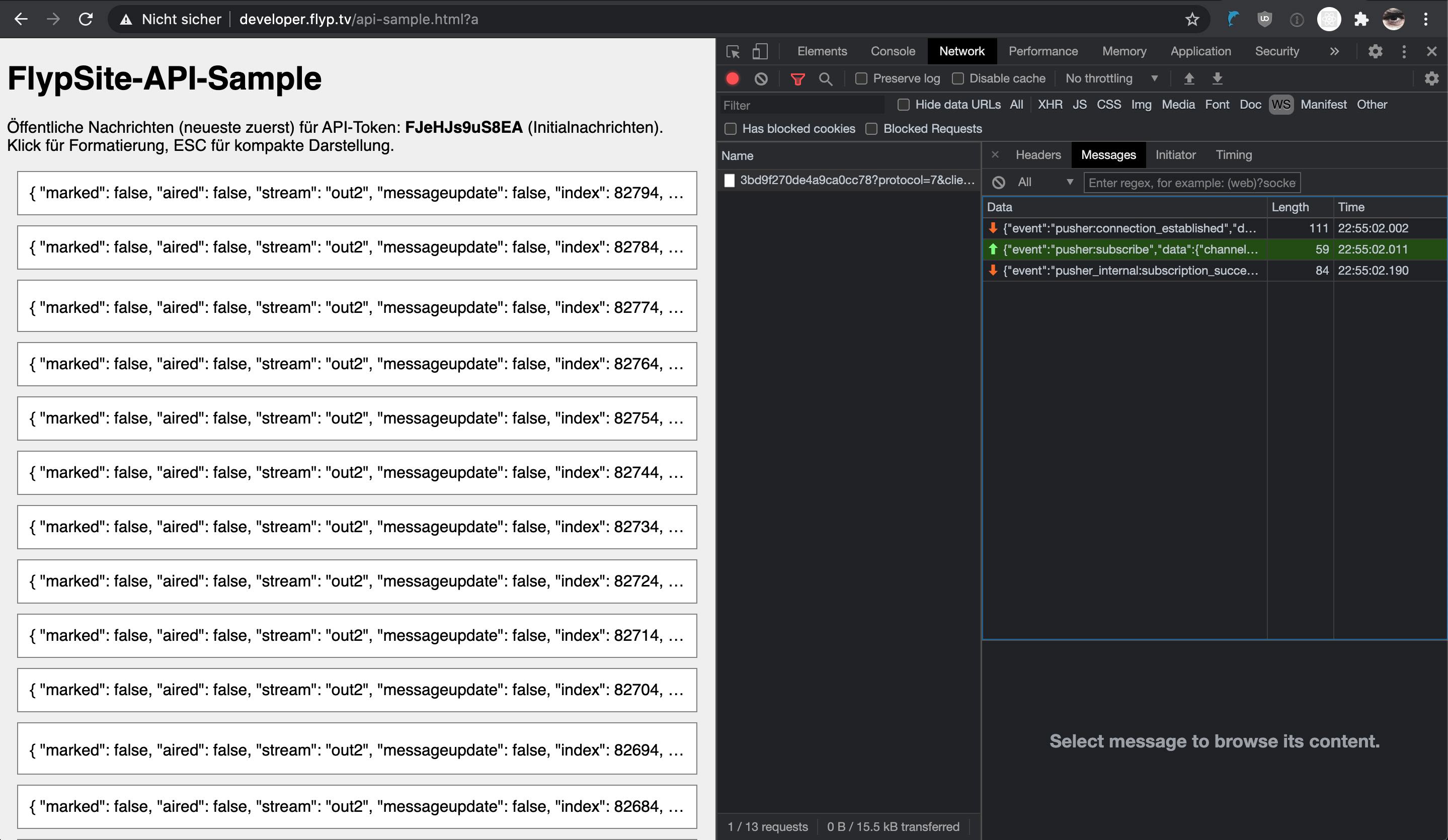 Websocket-Kommunikation, vgl. Network-Panel (Filter: WS)