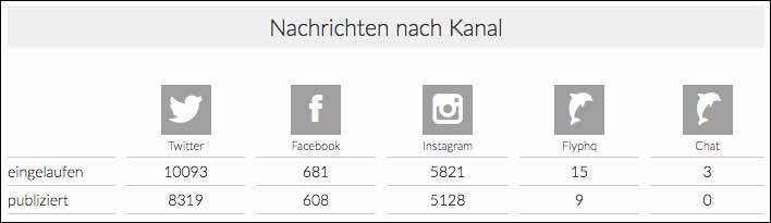 Über die gesamte Eventzeit (3.1. bis 11.1. 24 Uhr) wurden über 16.000 Nachrichten eingesammelt; Instagram hat einen beachtlichen Anteil. Bei der Zahl der Facebook-Nachrichten ist zu beachten, dass bei Facebook keine Suche nach Hashtags o.ä. möglich ist; es wurden nur die Posts/Shares auf der Facebook-Page der Elbphilharmonie eingesammelt.