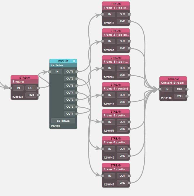 Die FlypSite „in Bewegung“ festzuhalten, war das Ziel einer weiteren kleinen haus-internen Produktion: Wir subskribierten die Beiträge aus dem #elphi-Event in einem neuen, leeren Event und ließen sie mit einem kleinen Javascript automatisch in den Eingang einlaufen. Von dort ging es dann mit dem Plumber (und einer „Round Robin“-Engine) weiter: sie verteilt die einlaufenden Nachrichten gemäß dem eingerichteten Plumbing (vgl. Abbildung) auf die Kacheln.